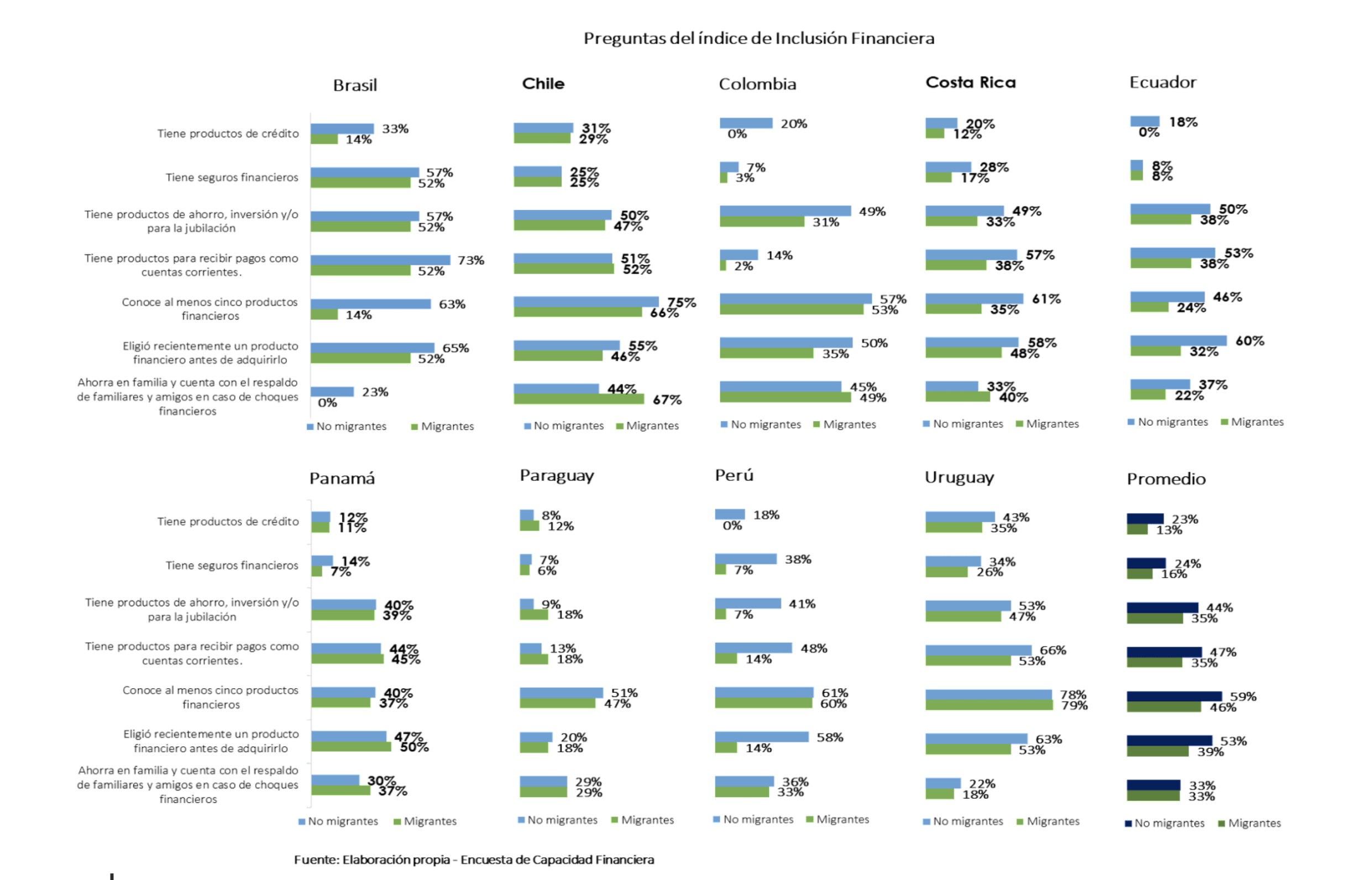 In the case of Latin America and the Caribbean, the financial capabilities surveys carried out by CAF for Colombia (2019), Brazil (2020), Ecuador (2020), Panama (2020), Paraguay (2020), Peru (2020), Uruguay (2020), Chile (2023) and Costa Rica (2023) allow analyze the differences in the characteristics of migrants compared to people born in the country of residence in relation to knowledge, possession, use and choice of financial products, as well as financial behaviors related to savings as seen in Graph 1, which shows the questions that are part of the financial inclusion index of the financial capabilities surveys carried out with the methodology developed by the OECD.
