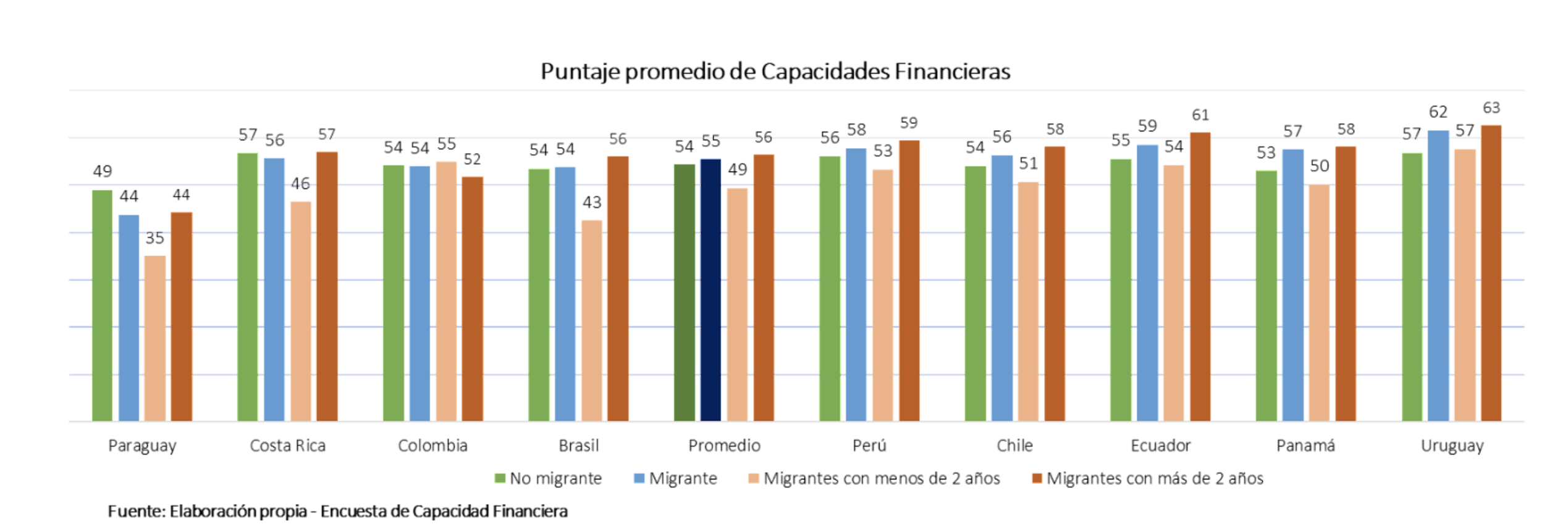 In relation to the score of the financial capabilities index, Graph 5 shows an average gap of 1 percentage point in favor of migrants (55), and the case of only two countries where the average scores of migrants are lower than that of non-migrants.