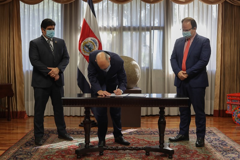 In an effort to enhance the well-being of the population and sustainable development in the country, the executive president of CAF—development bank of Latin America—, Luis Carranza Ugarte, signed with Costa Rica Central Bank president Rodrigo Cubero Brealey an agreement for Costa Rica’s accession as a full member of the multilateral body. Costa Rica’s President Carlos Alvarado and Finance Minister Elian Villegas attended the signing ceremony held at the Presidential Palace as guests of honor.