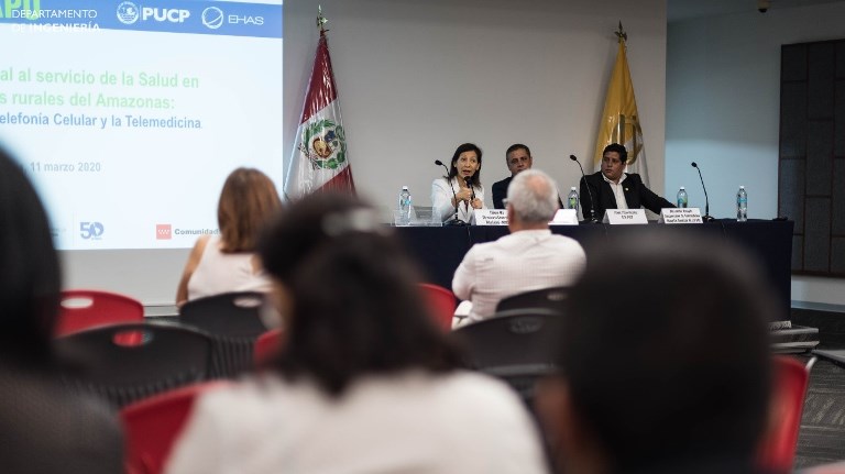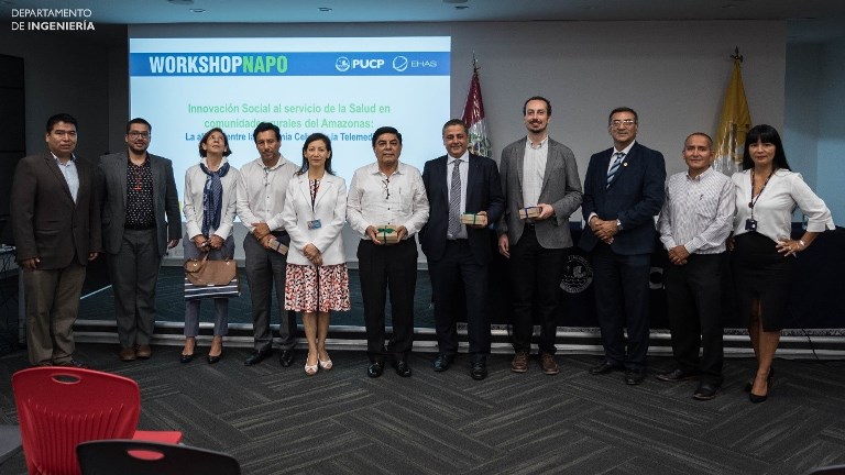 On March 11, the workshop”Social Innovation for Health in Rural Communities in the Amazon: Partnership between Mobile Telephony and Telemedicine,” was held at Pontificia Universidad Católica del Perú (PUCP). The event was organized by the Spanish NGO Fundación EHAS and the PUCP Rural Telecommunications Group, which are involved in the NAPO Project in a strategic partnership with the Social Innovation Directorate at CAF—development bank of Latin America—, AECID (Spanish Agency for International Cooperation for Development) and the Community of Madrid. The meeting discussed strategies implemented by the NAPO Project in the Peruvian Amazon since 2016, providing mobile broadband connectivity and telemedicine tools to their isolated communities, with the aim of improving their access to communication and high-quality health care.