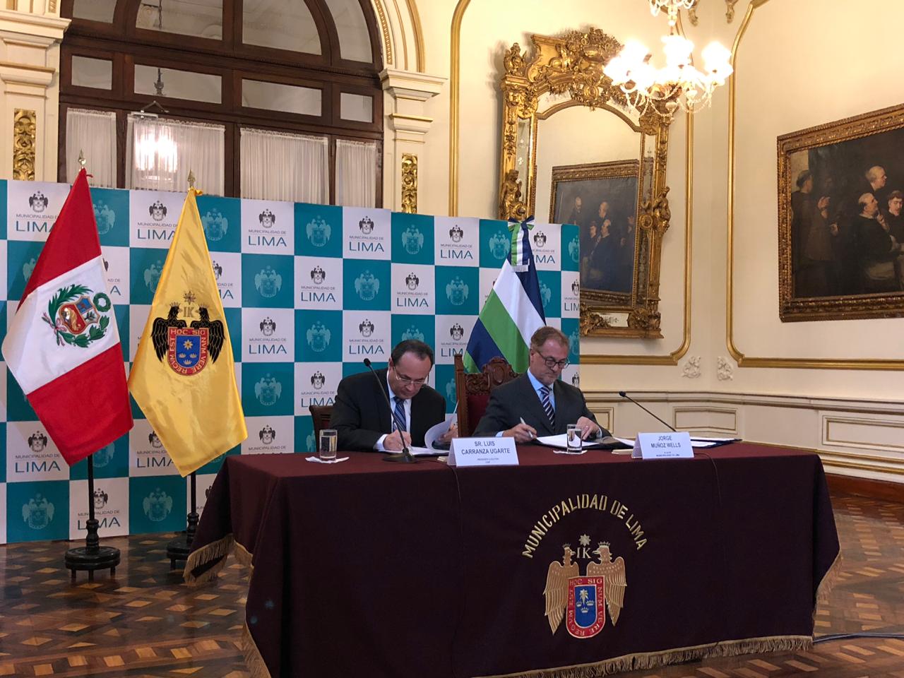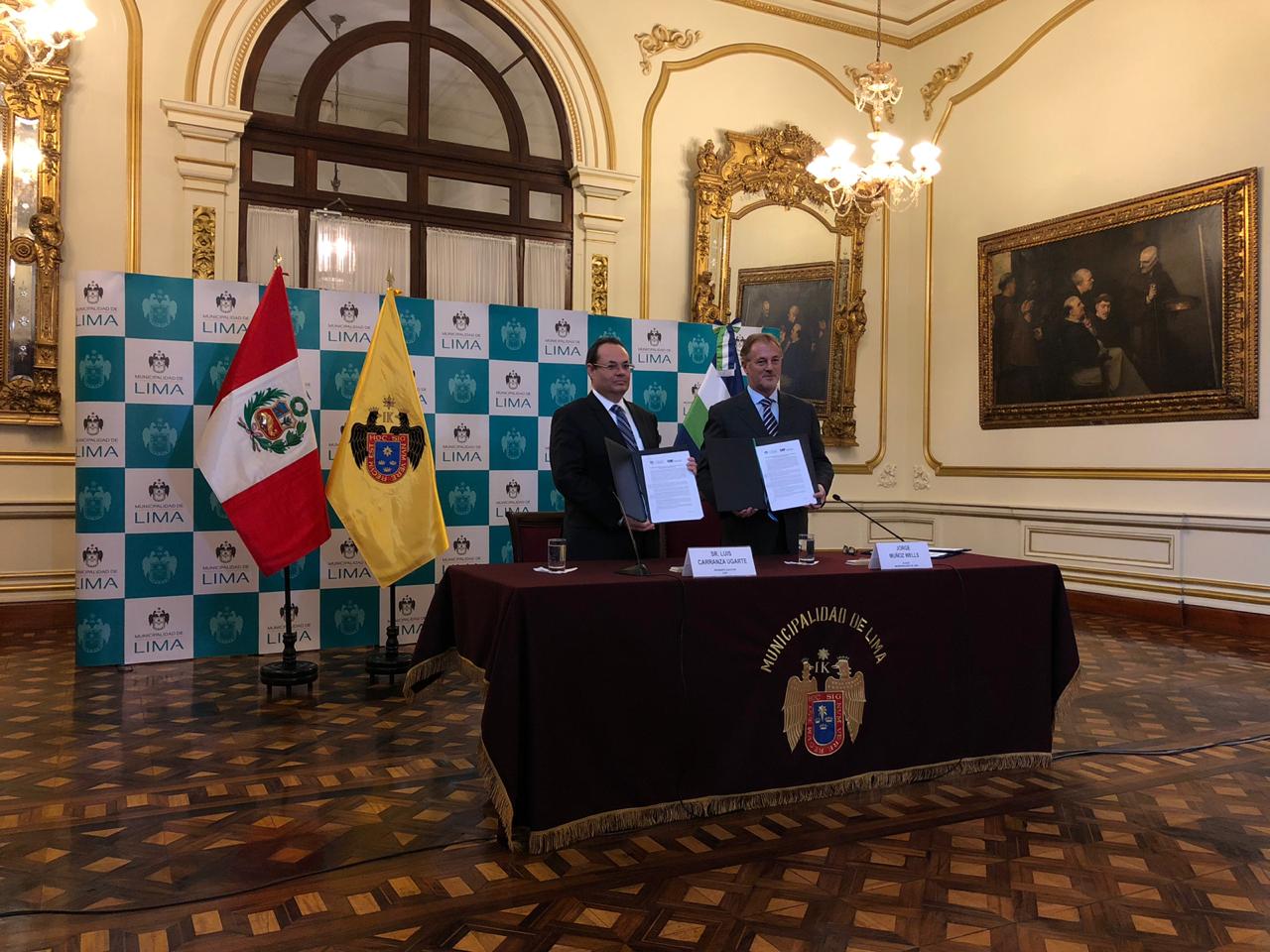 Lima Mayor Jorge Muñoz and CAF executive president Luis Carranza signed a Memorandum of Understanding for projects to be developed by both entities. Cooperation between the parties will focus on strategic issues for the city such as urban development, mobility, infrastructure, environmental sustainability and institutional strengthening, among others.