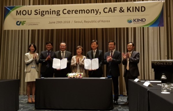 CAF -banco de desarrollo de América Latina- y la Corporación de Infraestructura y Desarrollo Urbano de la República de Corea (KIND por sus siglas en inglés), firmaron un Memorando de Entendimiento para explorar oportunidades de cooperación y colaboración en asuntos de interés común, especialmente en el desarrollo de infraestructura sostenible, en la que el sector privado juega un rol fundamental.