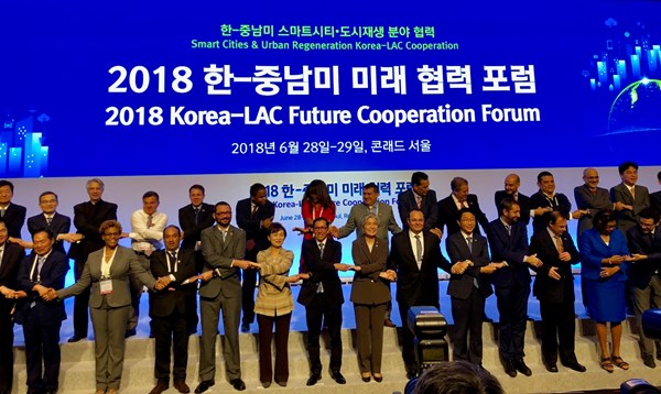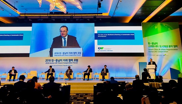 Durante su visita a Corea del Sur, el Presidente Ejecutivo de CAF se reunió con la ministra de Relaciones Exteriores de la República de Corea, Kang Kyung-wha, la ministra de Tierras, Infraestructura y Transporte, Kim Hyun-mee, la presidenta de la Agencia de Cooperación Internacional de Corea del Sur (KOICA), Lee Mikyung, el director general de Finanzas para el Desarrollo del Ministerio de Estrategia y Finanzas de Corea del Sur, Yoon Taesik; y participó en el “Foro de Cooperación Futura Corea-América Latina 2018”.