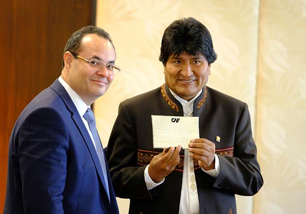El presidente Morales agradeció el apoyo constante de CAF al país y señaló "El trabajo de CAF ha sido tan importante para la integración de los pueblos, primero de la región andina y ahora de América Latina. Entiendo que esta sesión de directorio es también como un reconocimiento a los avances del Estado Plurinacional, bajo la inspiración de los movimientos sociales en coordinación con nuestros profesionales comprometidos con la patria, con resultados importantes en la parte económica".