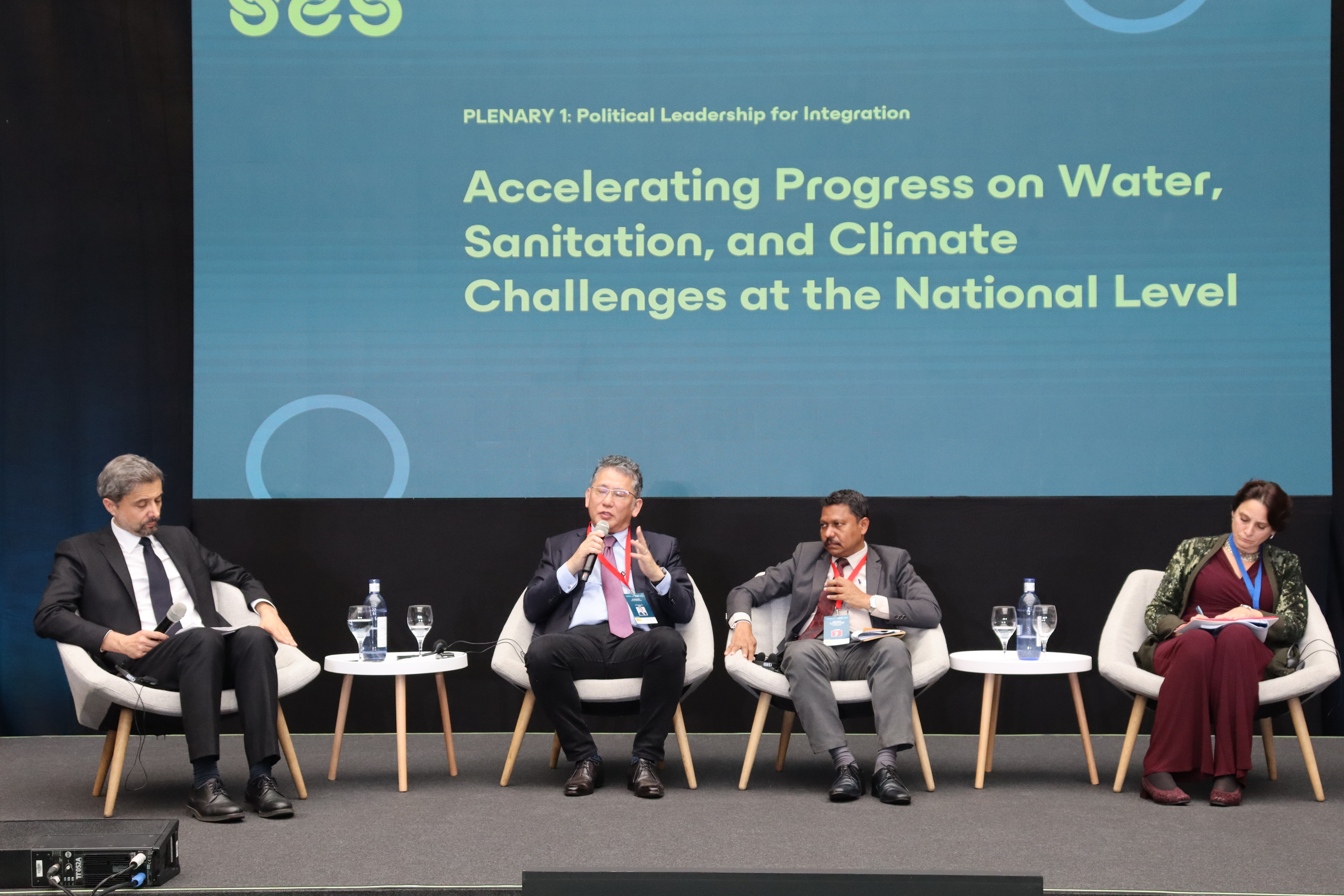 En la sesión plenaria “Liderazgo político en favor de la integración”, Christian Asinelli, vicepresidente Corporativo de Programación Estratégica de CAF, subrayó el compromiso de la institución con la sostenibilidad y la acción climática. En esta plenaria, moderada por Álvaro Lario, presidente del Fondo Internacional de Desarrollo Agrícola (FIDA) y presidente de ONU-Agua; participaron también Hansaka Wijemuni, viceministro de Salud y Medios de Comunicación de Masas de Sri Lanka; Veronica Manfredi, directora de Cero Contaminación, Resiliencia Hídrica y Transición Urbana Verde de la Comisión Europea; Kinya Seto Director, director ejecutivo de la Corporación LIXIL; y Fan Zhang, líder global para Agua y Prosperidad del Banco Mundial.