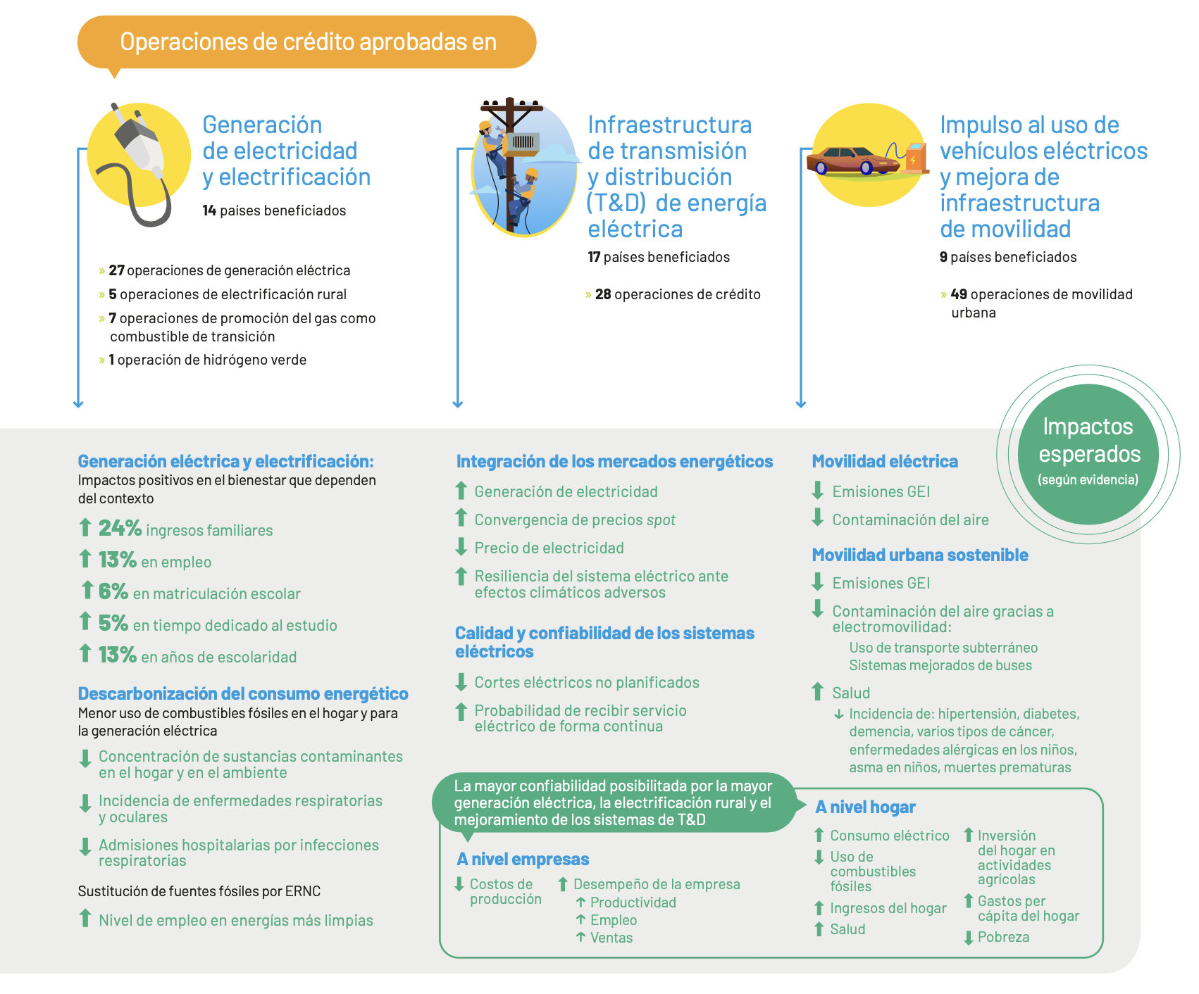 El apoyo de CAF a la generación adicional y la infraestructura de electrificación tiene el potencial de aumentar el acceso de los hogares a energía eléctrica, con efectos positivos en ingresos, calidad de vida y educación. Además, el incremento de la electrificación, junto el apoyo de CAF para facilitar el acceso al gas natural como combustible de transición, podría contribuir a reducir el uso de fuentes más contaminantes y mejorar la calidad del aire tanto dentro de los hogares electrificados como en las comunidades cercanas a las plantas de generación eléctrica a partir de fuentes fósiles, con efectos positivos en la salud, especialmente de los niños. Adicionalmente, la transición hacia ERNC generaría aumentos en el empleo en las fases de operación y mantenimiento de la nueva infraestructura.