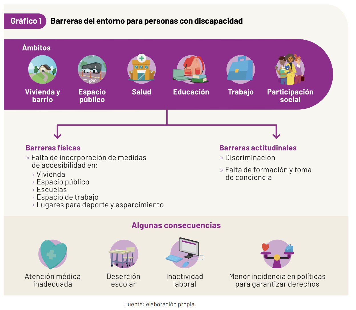 Las personas con discapacidad enfrentan barreras físicas – entre ellas la falta de rampas, barandales y ascensores– que les impiden acceder a servicios esenciales como el transporte, la salud, la educación, así como al mercado de trabajo. A esto se suman barreras actitudinales, reflejadas en la discriminación, prejuicios y estigma que se manifiestan en diversos ámbitos de su vida cotidiana, atribuidos principalmente a la falta de formación y toma de conciencia de la ciudadanía en general y de actores clave en particular, como el personal de salud, docentes y empleadores. Estas barreras se profundizan cuando la discapacidad se cruza con comunidades históricamente excluidas, como las mujeres, familias rurales, comunidades indígenas o afrodescendientes y personas en situación de pobreza.