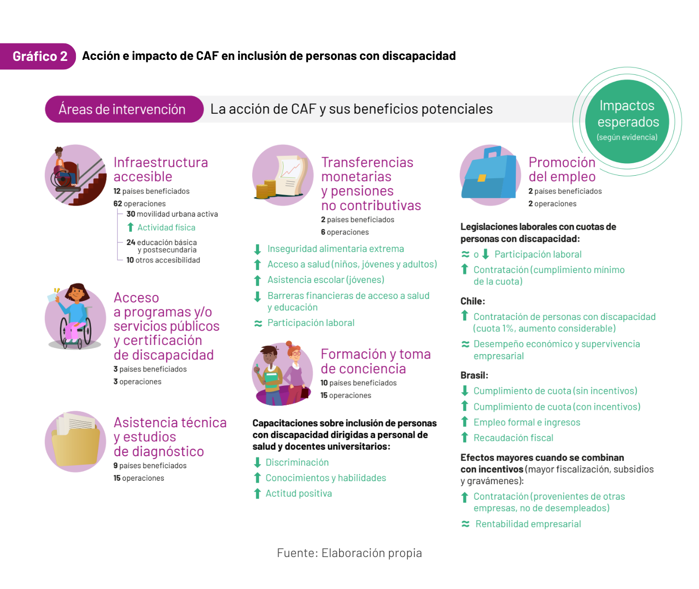 Bajo esta premisa y en línea con la agenda “Bienestar Social Inclusivo” de nuestra estrategia institucional hacia 2026, el informe ImpactoCAF - Menos barreras y más oportunidades para la inclusión de personas con discapacidad en ALC detalla que, entre 2018 y 2025, CAF ha financiado 92 operaciones que han beneficiado a 14 países de la región a través de intervenciones entre las cuales se destacan la infraestructura accesible, las transferencias monetarias y pensiones no contributivas, el acceso a programas y/o servicios públicos dirigidos a personas con discapacidad y la certificación de discapacidad, la promoción del empleo, la asistencia técnica y estudios de diagnóstico, y la formación y toma de conciencia del capital humano.