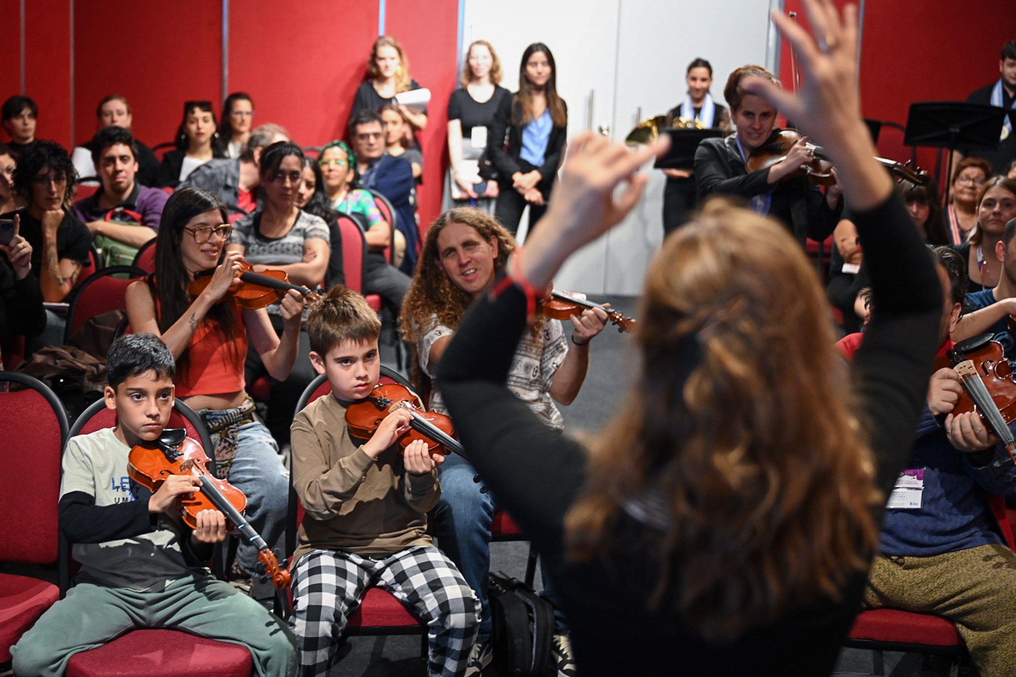 La conversación se desarrolló desde un enfoque práctico, iniciando con un ejercicio experimental con el público denominado "Orquesta del Primer Día", que sirvió como punto de partida para el diálogo posterior.