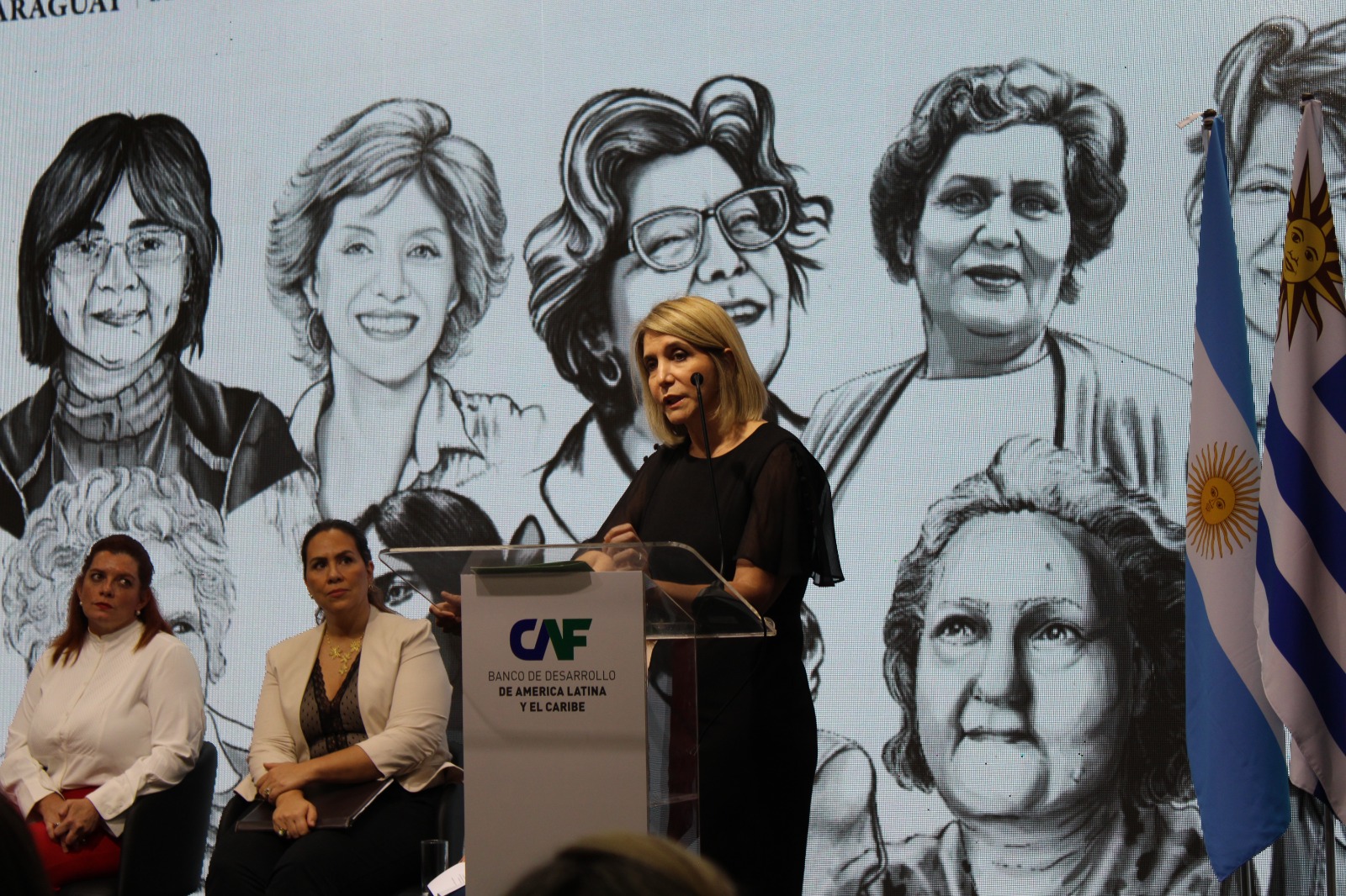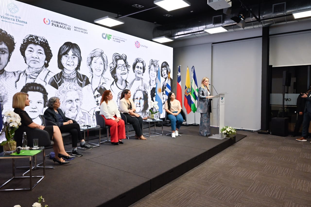 Luego de la charla de apertura, la Ministra de la Mujer, Cinthia Figueredo, agradeció a CAF por el apoyo y el trabajo conjunto, y destacó el valor del proyecto: “es una manifestación visual de nuestra determinación para avanzar juntas, para que cada niña y cada mujer de nuestra región pueda alcanzar su máximo potencial sin restricciones ni discriminación”. Laura Medina, la artista encargada de darle vida a los retratos y al mural, subió al escenario a relatar cómo fue su proceso. “Es un ofrecimiento, con un pincel lleno de honestidad; yo, como artista y feminista que trae sus trazos a la capital, desafiada por una pared en blanco, no he parado de pensar en las mujeres que dibujo y pinto, y a veces cargo el pincel de pintura conmovida hasta las lágrimas”. Para descubrir el mural la Primera Dama, Leticia Ocampos, expresó “este proyecto es una invitación a reflexionar sobre el papel crucial de las mujeres para un mundo más equitativo. Renovemos nuestro compromiso de apoyar y empoderar a las mujeres. El arte puede ser una poderosa herramienta para la inclusión y el cambio social”.
