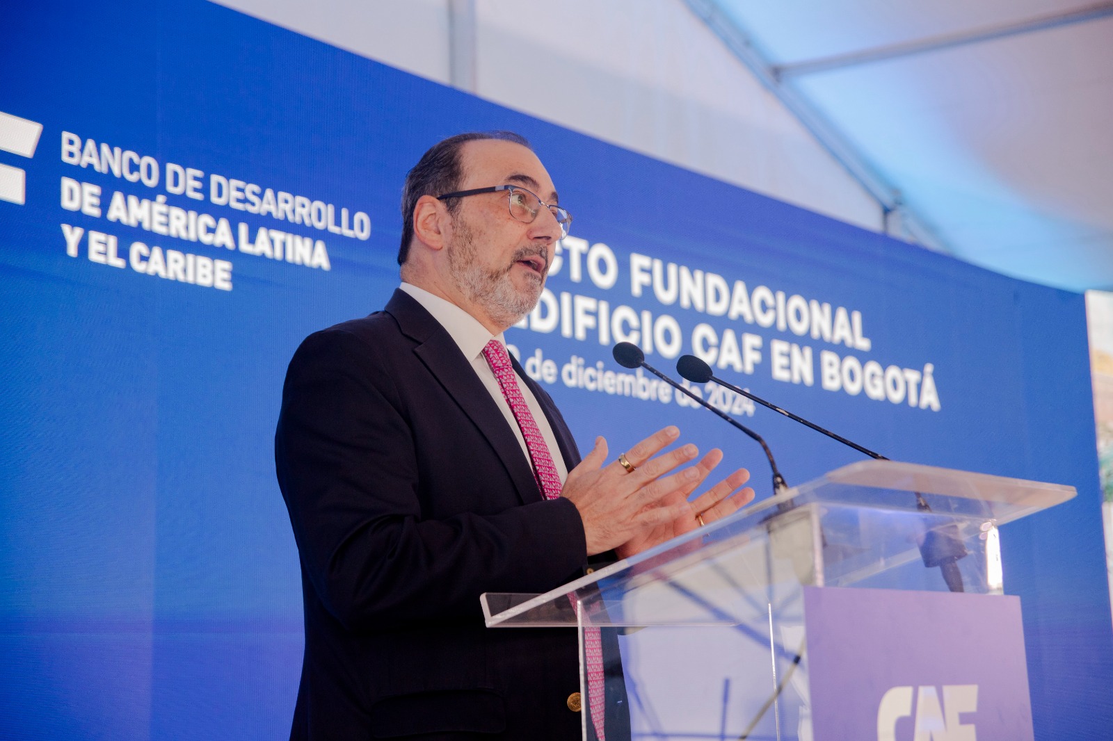 (Bogotá, 9 de diciembre de 2024). Durante la ceremonia de colocación de la primera piedra del edificio, Sergio Díaz-Granados, presidente ejecutivo de CAF, destacó que este proyecto es un reflejo de los valores de la institución y de su relación histórica con Colombia, uno de los países fundadores de CAF.