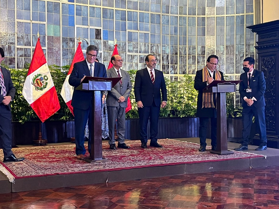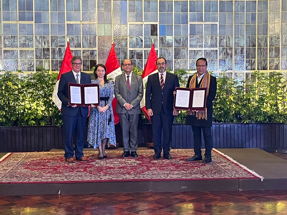 La firma del Memorando de Entendimiento estuvo liderada por el Ministro de Comercio Exterior y Turismo, Roberto Helbert Sánchez; y el Representante de CAF en Perú, Santiago Rojas Arroyo.