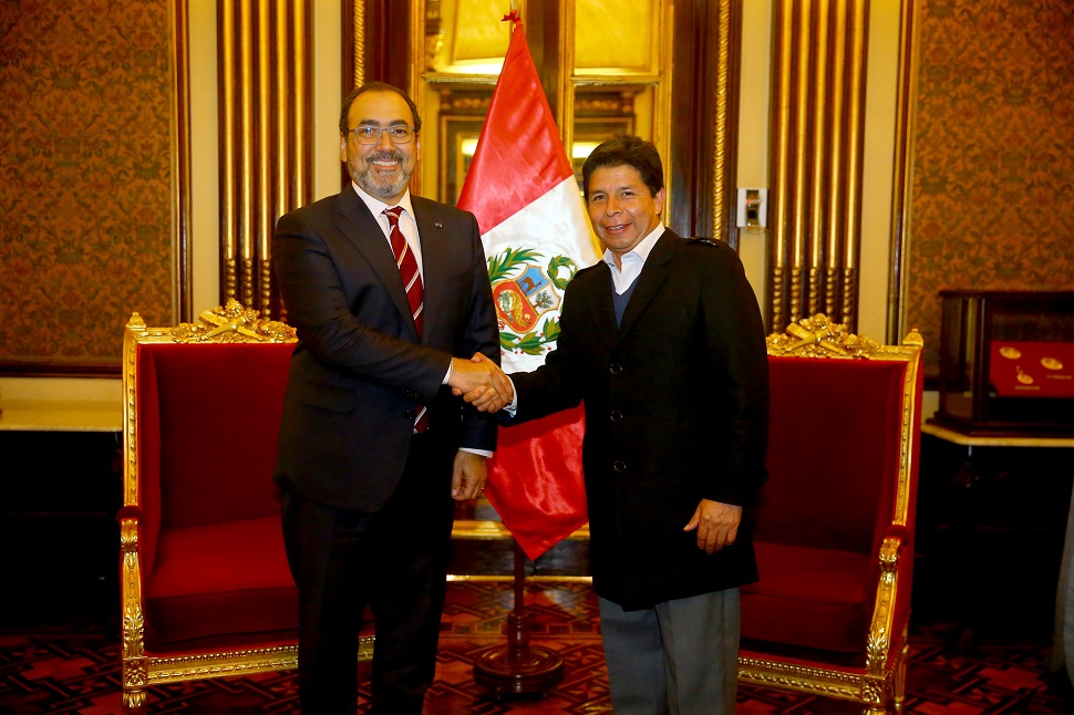 En su visita al Perú, el Presidente Ejecutivo de CAF también se reunió con el presidente de la República, Pedro Castillo Terrones, en el que coincidieron en la importancia de fortalecer la educación, infraestructura educativa y servicios básicos a familias que viven en cerros de Lima y regiones alejadas del país, entre ellas las comunidades nativas de las zonas de frontera.