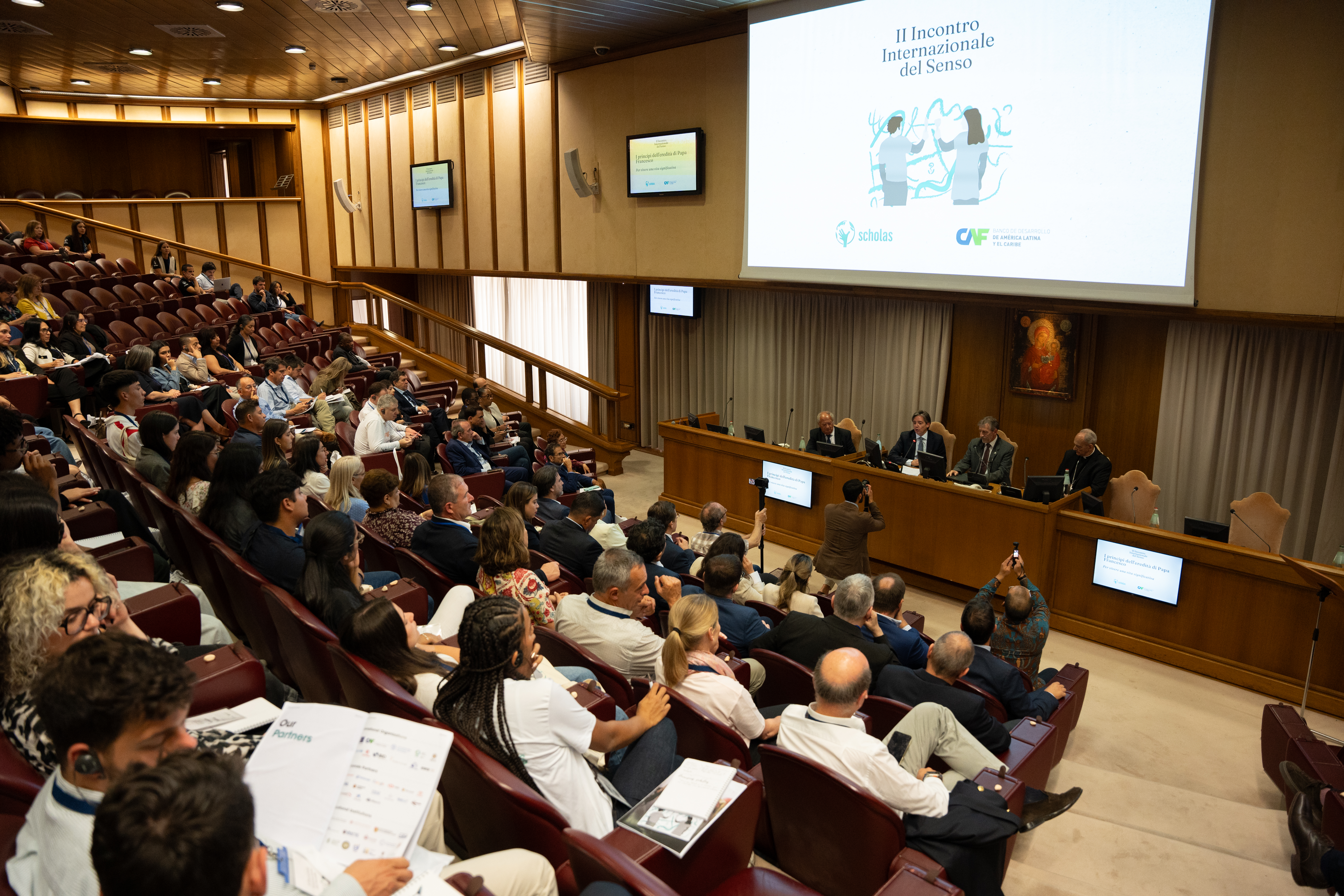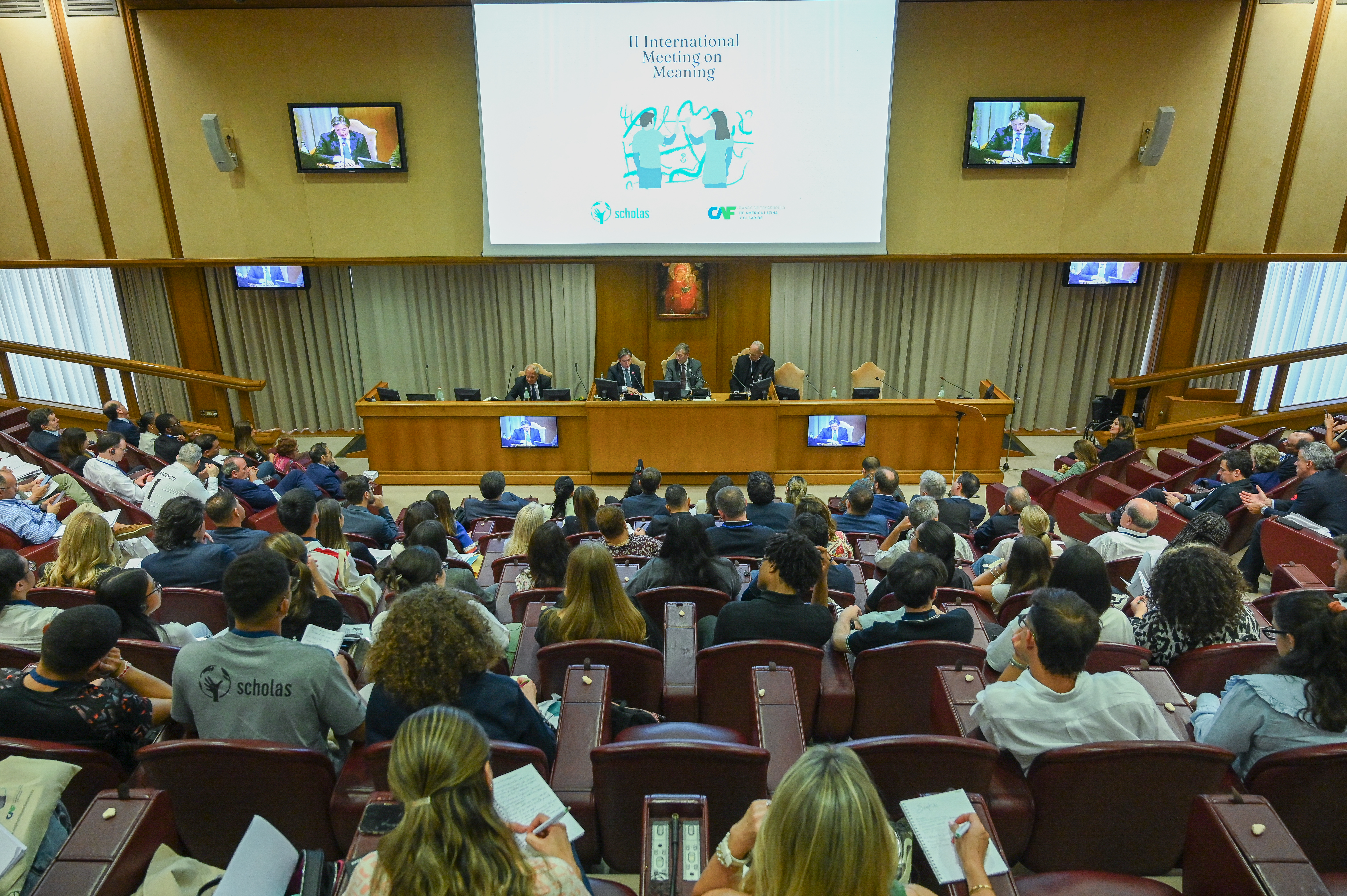 Este martes, en el Aula del Sínodo, Scholas Occurrentes y CAF - Banco de Desarrollo de América Latina y el Caribe - inauguraron el II Encuentro Internacional del Sentido, un evento global que responde con proyectos concretos a la crisis de Sentido que convocó el Papa Francisco el 5 de junio del 2020, a buscar nuevas maneras innovadoras de respuesta. Se realizó, no solo un balance de lo hecho hasta ahora con testimonios concretos de jóvenes que viajaron desde sus países, sino también referentes eclesiásticos locales, gobernadores, alcaldes, jueces y legisladores involucrados en los proyectos.