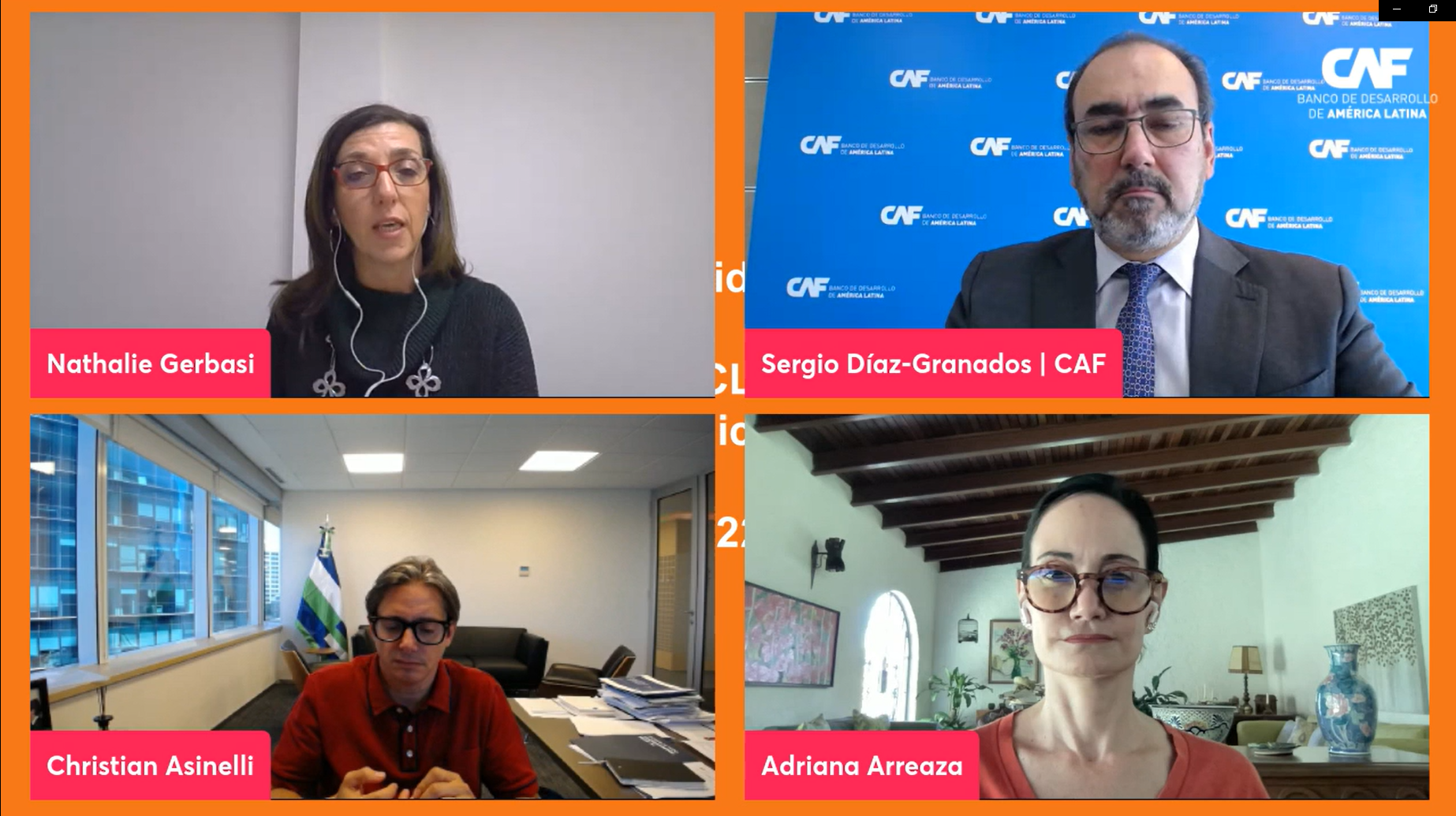 Tras las palabras de Christian, Nathalie Gerbasi, Directora (e) de Desarrollo Institucional y Capacitación destacó la importancia de tener un espacio de enseñanza como el que brinda CAF a toda la región. Por su parte, Matías Bianchi, coordinador académico del Diplomado agradeció agradecimiento a las universidades y a los alumnos por los trabajos grupales realizados, que contribuyen a mejorar las políticas públicas y el desarrollo de las comunidades.