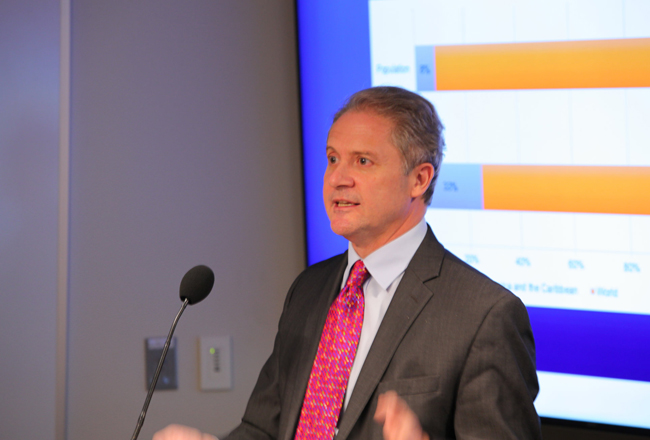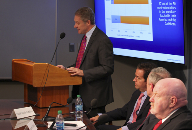 Jorge Srur, ejecutivo principal de la Dirección de Desarrollo Institucional de CAF, destacó que la violencia es la mayor problemática actual de América Latina: "47 de las 50 ciudades más violentas en el mundo están ubicadas en Latinoamérica y el Caribe, mientras 33% de los homicidios ocurren en esta región, que solo representa 8% de la población mundial".