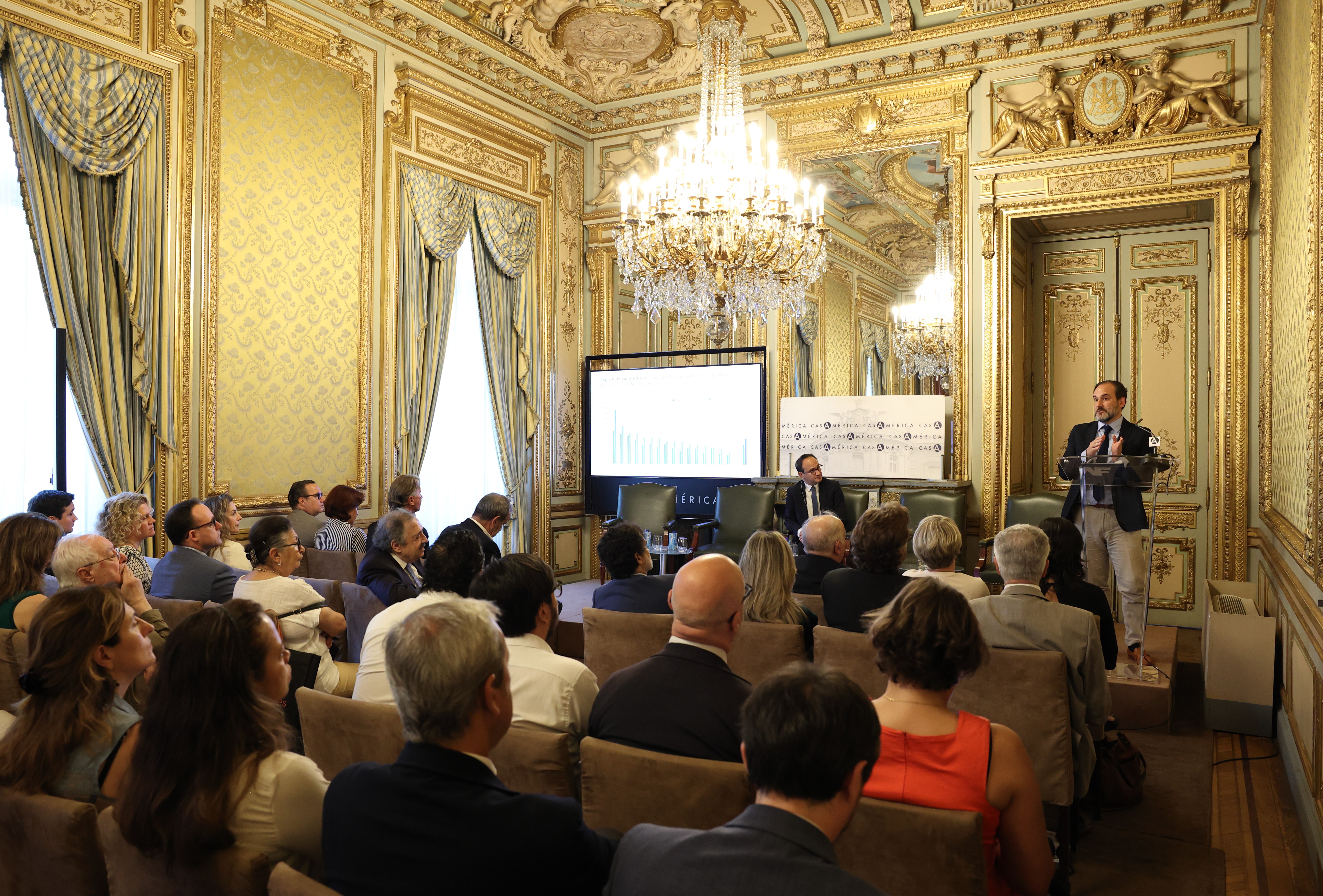 El gerente para Europa, Asia y Medio Oriente de CAF -banco de desarrollo de América Latina-, Ignacio Corlazzoli, y la gerenta de Conocimiento de la entidad, Verónica Frisancho, participaron en la presentación del informe Perspectivas económicas de América Latina y el Caribe, en la Casa de América de Madrid. El evento fue clausurado por el secretario general iberoamericano, Andrés Allamand, y el secretario de estado para Iberoamérica, Juan Fernández Trigo.