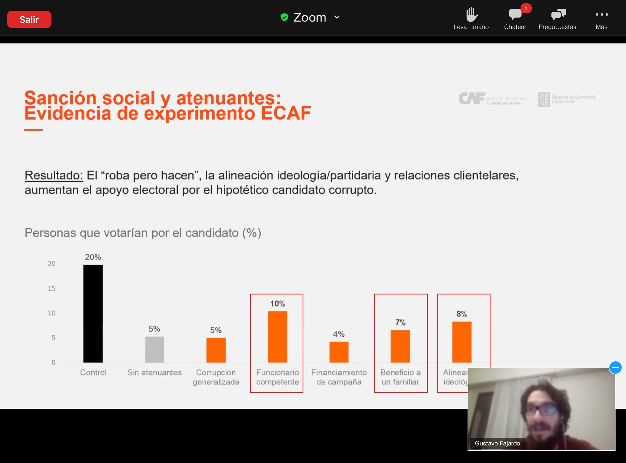 En este escenario, Gustavo Fajardo —economista principal de la Dirección de Investigaciones Socioeconómicas de CAF— expuso las reflexiones y datos del Reporte de Economía y Desarrollo (RED) 2019 y se concentró en las claves para prevenir la corrupción en la región. La publicación contiene cuatro ejes para sustentar una estrategia para prevenir la corrupción a través de políticas públicas integrales.
