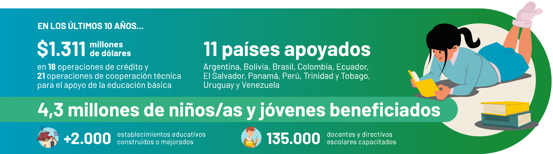 Buena parte de los componentes de estos proyectos responden al apoyo a la educación básica que impulsa CAF, como parte de la agenda “Bienestar social inclusivo” de su estrategia corporativa hacia 2026. En el marco de esta área de intervención, entre 2014 y 2024, CAF ha destinado USD 1.311 millones en 18 operaciones de crédito y 21 cooperaciones técnicas*, beneficiando a más de 4,3 millones de niños, niñas y jóvenes en toda la región, desde el nivel inicial hasta el secundario. Además, CAF apoya iniciativas para la educación superior de calidad, la formación técnica y profesional, y la transición al mercado laboral.