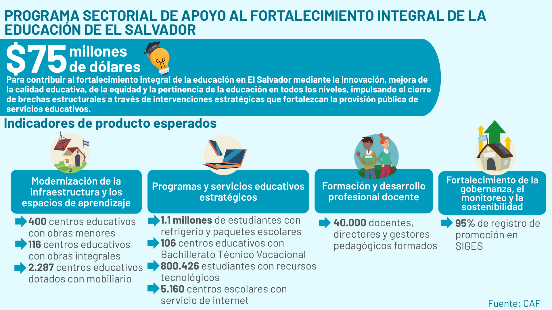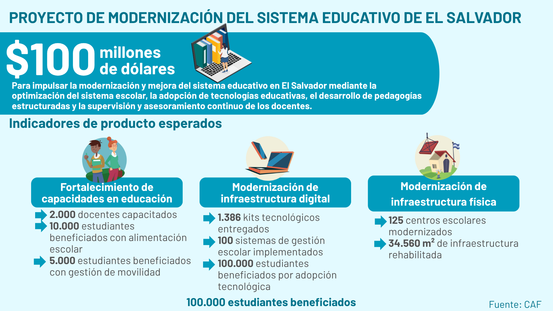 Con una inversión de más de USD 100 millones financiados por CAF, este proyecto busca impulsar la modernización y mejora del sistema educativo en El Salvador a través de los siguientes componentes: