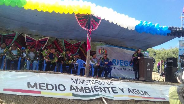 Durante su visita a Bolivia, Luis Carranza, presidente ejecutivo de CAF, junto con el Presidente de Bolivia, Evo Morales, autoridades nacionales, regionales y población beneficiaria, inauguraron una presa y sistema de riego en el municipio de Mojocoya, en la provincia Zudañez, departamento de Chuquisaca, que pretende mejorar los ingresos de la comunidad de Astilleros, a través de la diversificación e incremento de la producción agrícola y riego.