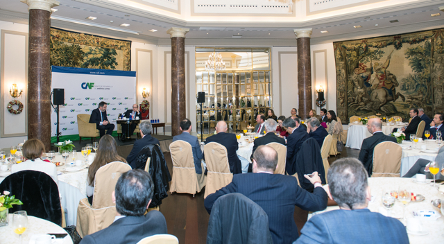 CAF -banco de desarrollo de América Latina-, organizó este martes en Madrid el desayuno-coloquio ‘España y América Latina en la encrucijada política actual’. Durante el evento, el director corporativo para Europa de CAF, Guillermo Fernández de Soto, y el director de ABC, Bieito Rubido, dialogaron sobre los acontecimientos más importantes del año en lo político y lo económico y sobre la visión que existe en América Latina de la relación con el conjunto de la Unión Europea (UE).