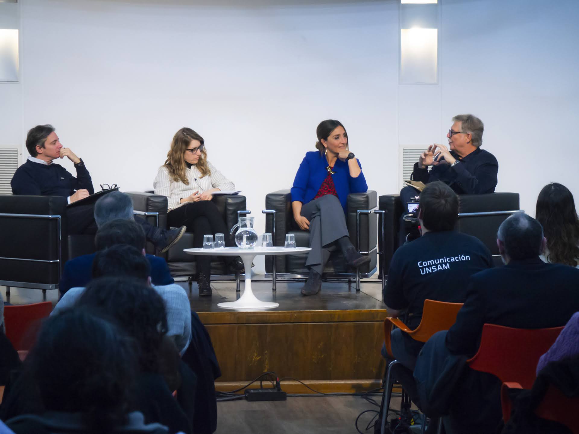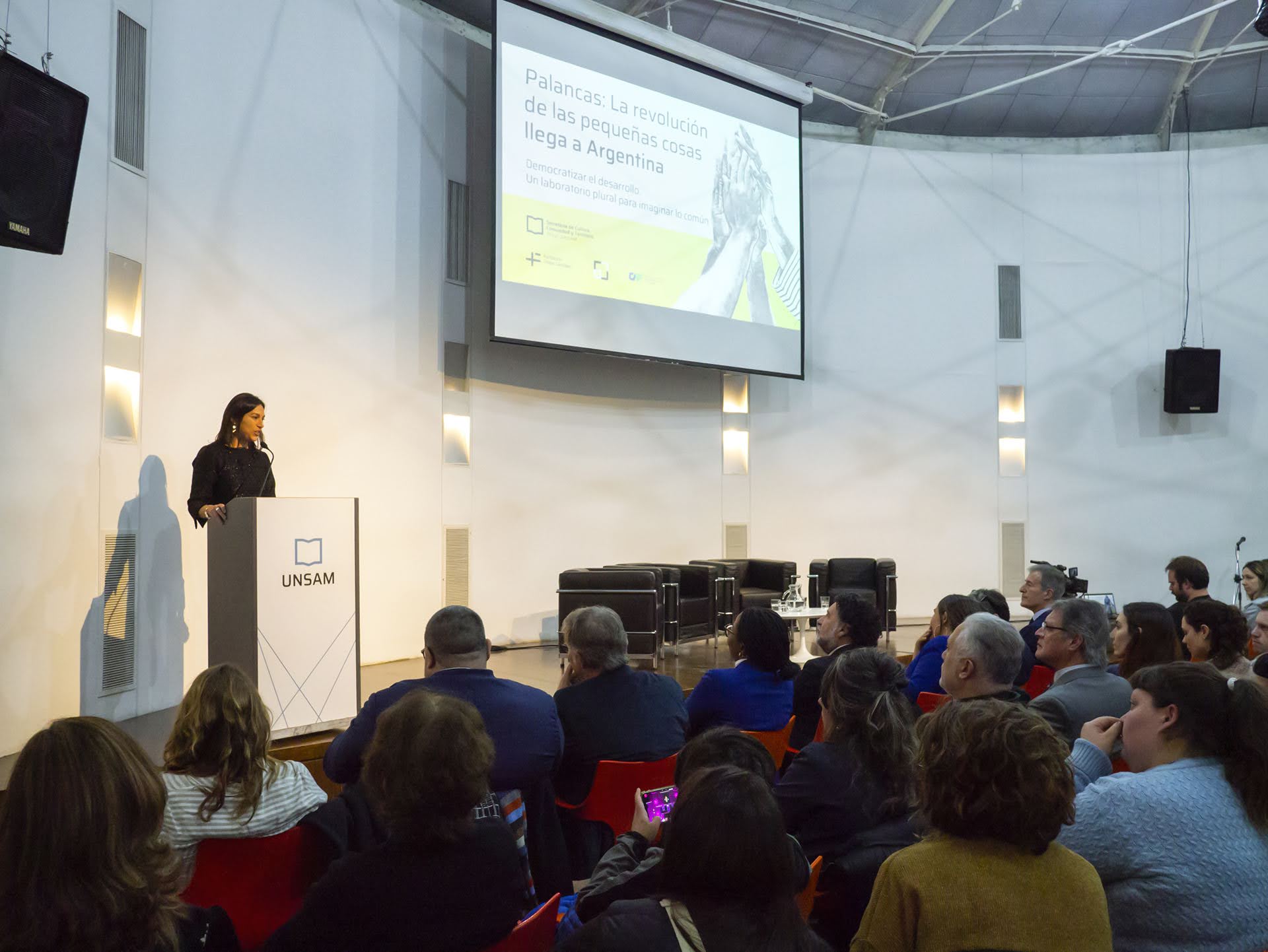 El lanzamiento de Palancas Argentina se realizó el jueves 11 de julio en el Aula Tanque del Campus Miguelete UNSAM. Participaron de la actividad Carlos Greco (rector de la UNSAM), Rocío Martínez-Sampere (directora de la Fundación Felipe González), Christian Asinelli (vicepresidente Corporativo de Programación Estratégica de CAF), Susana Edjang (representante de CAF en Argentina), Verónica Frisancho (gerente de Conocimiento CAF), Nathalie Gerbasi (directora de Desarrollo Institucional y Capacitación de CAF), Mario Greco (secretario de Cultura, Comunidad y Territorio UNSAM) y Leila Mesyngier (directora general de Revista Anfibia).