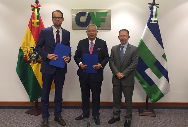 La firma de la nueva línea de crédito se llevó a cabo en la ciudad de La Paz, liderada por Hugo Sarmiento, vicepresidente de finanzas, y Emilio Uquillas, director representante en Bolivia, por parte de CAF, y de Klaus Vöhringer, director agencia regional del KfW para Bolivia, Chile y Paraguay, en representación de KfW.