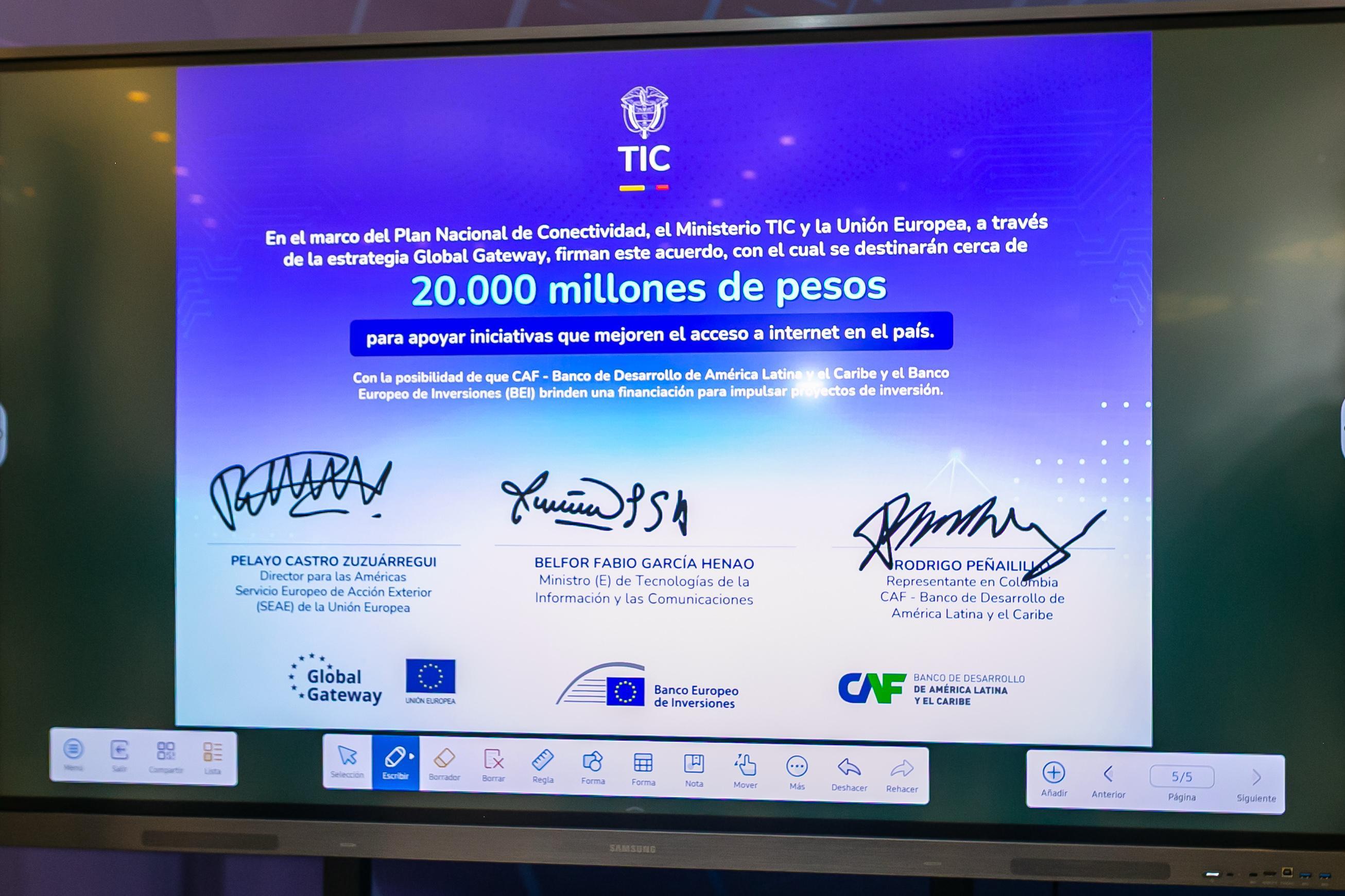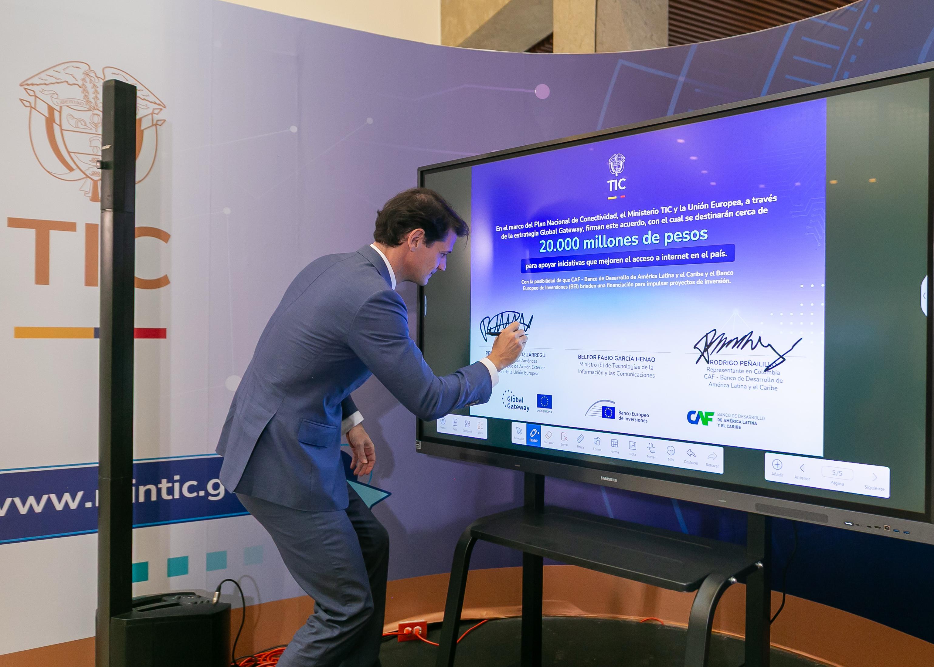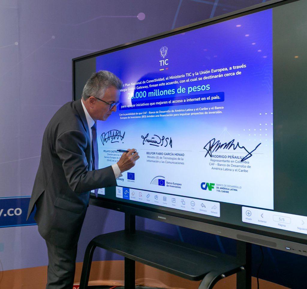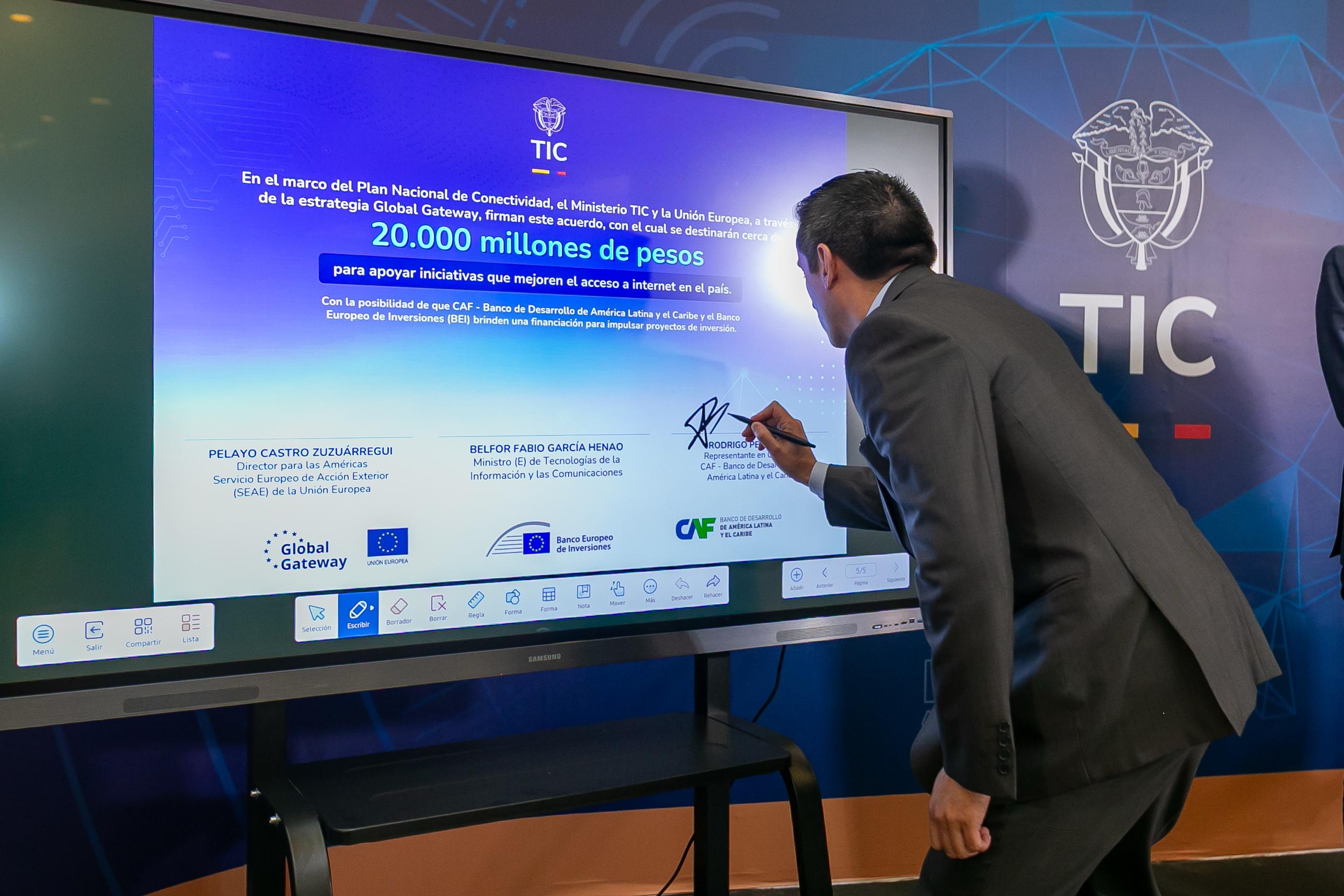 Bogotá, febrero 21 de 2025 (@Ministerio_TIC) –. Para fortalecer la conectividad en el país y la promoción del desarrollo en los territorios, especialmente en zonas rurales y apartadas, el Ministerio TIC, la Unión Europea (UE) y CAF -banco de desarrollo de América Latina y el Caribe- firmaron un Acuerdo de Cooperación con el cual se destinarán cerca de $20.000 millones para apalancar financiamientos del Banco Europeo de Inversiones (BEI) y de CAF, y así apoyar el Plan Nacional de Conectividad del país. En el acto participaron el ministro (e) TIC, Belfor Fabio García Henao; el director para las Américas del Servicio Europeo de Acción Exterior de la Unión Europea (UE), Pelayo Castro Zuzuárregui; y el Representante de CAF en Colombia, Rodrigo Peñailillo.