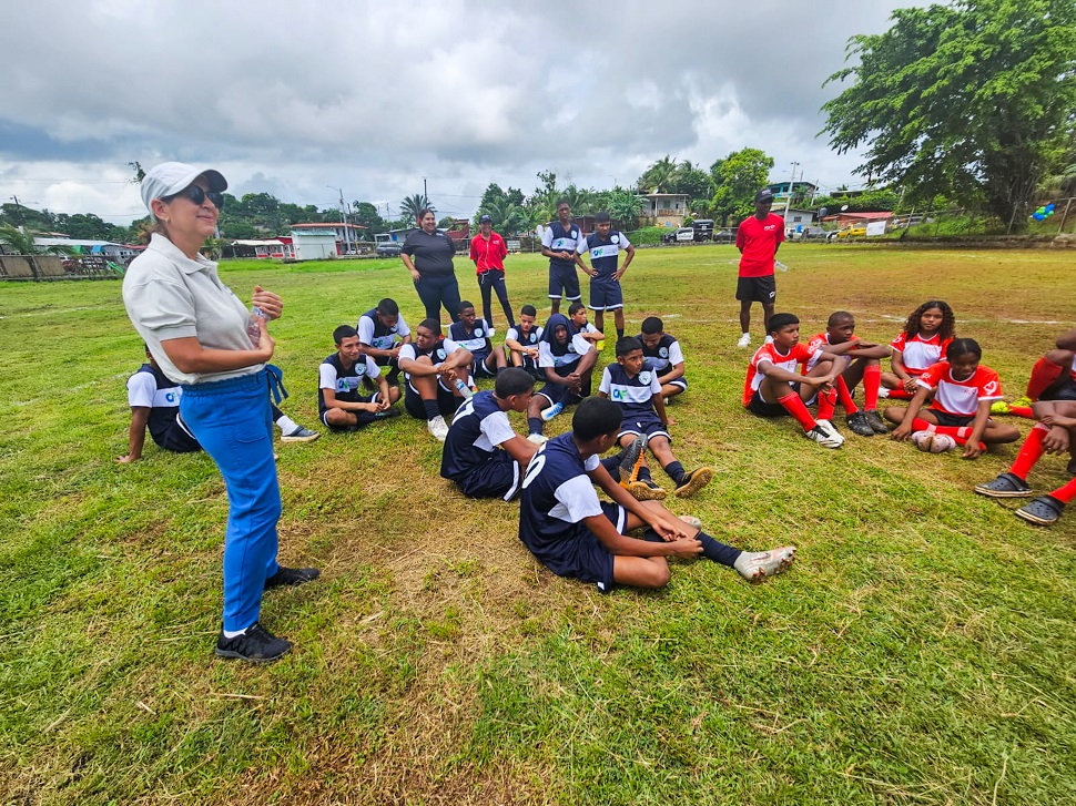 La representante de CAF en Panamá, Lucía Meza, acompañada de la ejecutiva principal de la Oficina País, María Eugenia Miquilena; junto a la coordinarora de Desarrollo de Proyectos de la fundación, Karielys Rodríguez y la coordinadora de Comunicaciones, Camila Torres, compartieron con los niños, entrenadores, líderes y moradores de la comunidad.