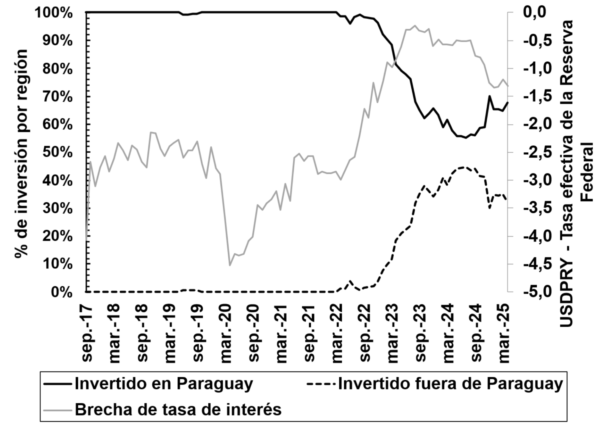 Cabe destacar que el canal mencionado anteriormente era menos relevante cuando la tasa de interés en USD en Paraguay (USDPRY) era significativamente más alta que en el exterior. Sin embargo, a finales de 2022 la Reserva Federal elevó su tasa de referencia, reduciendo la brecha entre la tasa de interés externa y la USDPRY, tras lo cual los fondos mutuos (FM) intensificaron sus inversiones en el exterior.