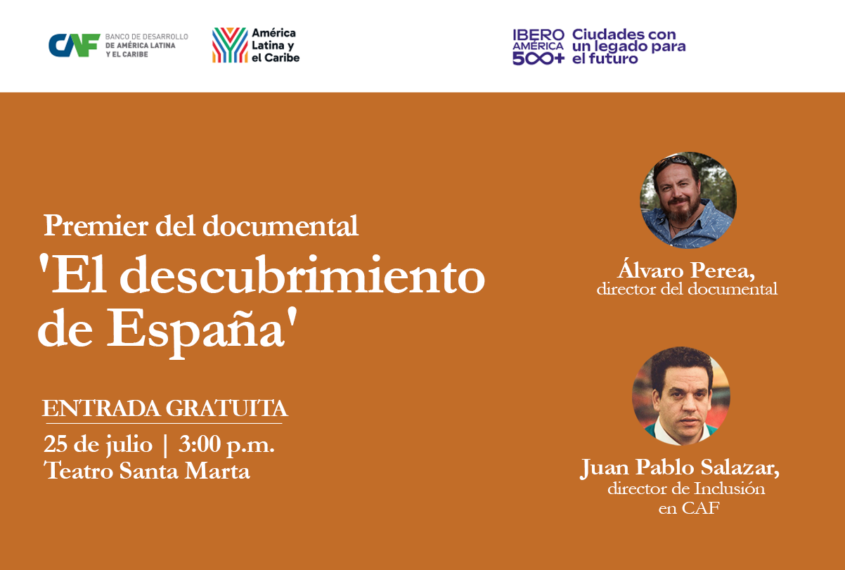 En el marco de las conmemoraciones por los 500 años de la fundación de Santa Marta, CAF –banco de desarrollo de América Latina y el Caribe– invita a la premier del documental El descubrimiento de España, dirigido por Álvaro Perea y Juan Pablo Salazar, que resume y amplía las reflexiones del libro Reescribir América antes de que nos escriban otros. Esta producción viaja por escenarios emblemáticos de la Península Ibérica –como Andalucía, Castilla y Extremadura– para indagar en los orígenes de la relación entre España y América Latina, usando como punto de partida los 500 años de Santa Marta, la ciudad más antigua de Suramérica fundada por españoles.