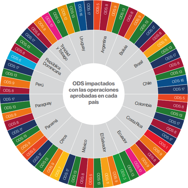 De este total, USD 7.094 millones fortalecieron el ecosistema emprendedor, el acceso al financiamiento para pymes y las inversiones sostenibles, apoyando el ODS 8 (Crecimiento Económico y Empleo Digno), el ODS 9 (Infraestructura Resiliente e Innovación) y el ODS 13 (Acción Climática). Además, se destinaron USD 3.486 millones a proyectos de seguridad hídrica y desarrollo urbano, apoyando ODS 6 y ODS 11. Se aprobaron USD 1.844 millones para infraestructura digital y transporte sostenible, contribuyendo al ODS 9 y ODS 11.
