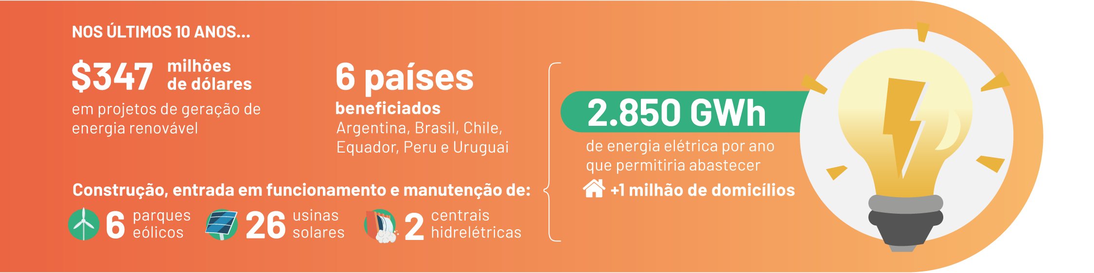 Entre 2014 e 2023, o CAF financiou 11 projetos de energia renovável por um valor total de US$347 milhões que permitiram aumentar a eletrificação rural e urbanana região. Esses projetos consistiram na construção, entrada em operação e manutenção de seis parques eólicos, vinte e seis usinas solares e duas centrais hidrelétricas.