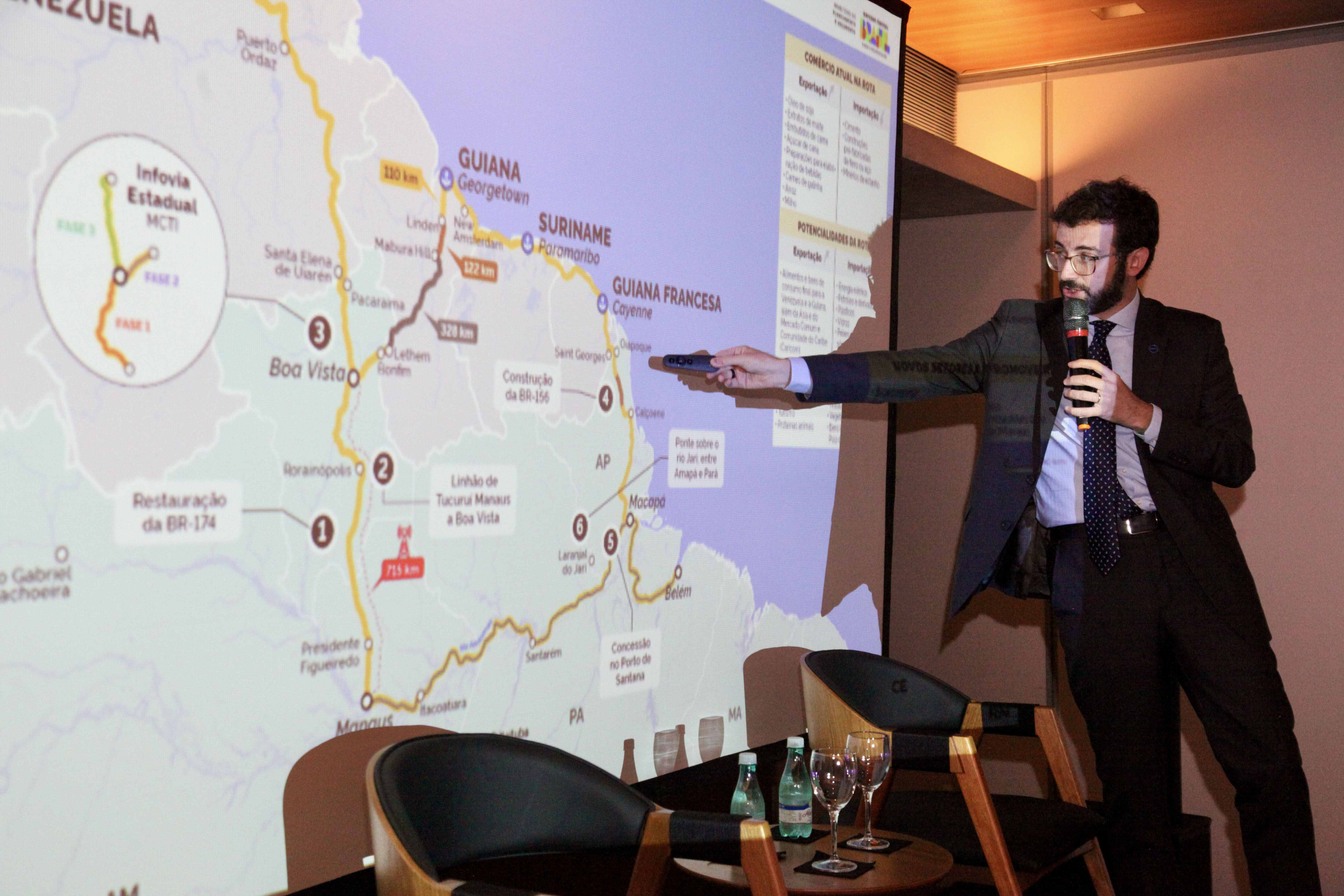 Em seguida, o secretário de Articulação Institucional do Ministério do Planejamento e Orçamento, João Vilaverde, fez palestra e abordou questões relacionadas ao planejamento, projeções, projetos já finalizados e outros que estão em curso ou previstos. Ao todo, serão 190 projetos, que devem afetar os 11 estados brasileiros que fazem fronteira com países da região.